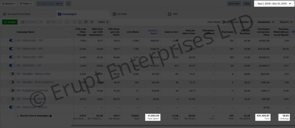 Graduation Testing Method.  The idea behind this method is to test all campaigns, ad sets and ads for winning indicators using small budgets first. This helped us to reach a total Return on Ad Spend of 18.93 within 4 months (€31,495 from €1,663 ad spend) and ensure we were getting good results on a consistent basis.